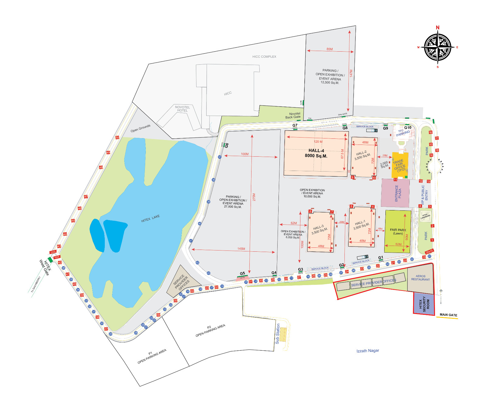 海德拉巴国际会展中心是由“Emaar MGF”印度公司建造并拥有,他们是阿联酋的公司。会展中心由雅高酒店集团管理。海得拉巴国际会展中心的座位容量是印度最大的和最先进的会议设施。它是集291000平方英尺(27000平方米)设施与287间套房的商务型酒店:海得拉巴诺富特酒店,建筑物总占地15英亩(6公顷)。这个会展中心可加大配置座位容量约6500。海得拉巴国际贸易展览有限公司(Hitex)是国际展览公司,是一个国家的最先进的场馆会议,贸易展览,并在印度公司活动。它的概念由德国建筑师于2003年1月和商务部长Arun Shourie,和公平贸易办公大楼安得拉邦前首席部长Chandrababu Naidu拥有。海得拉巴国际贸易展览有限公司是科技城企业的枢纽大脑,并拥有印度最现代化的展览中心。Hitex位于Madhapur(近科技城)里面。设施占地近100英亩(40公顷)。