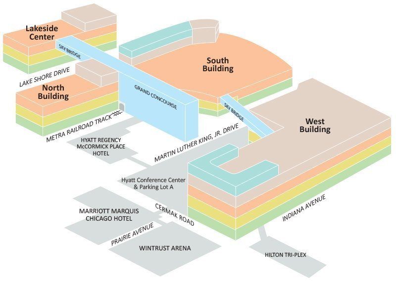 芝加哥迈考密会展中心位于美国芝加哥市中心,会展中心总面积为22万平方米,其中会议厅有112间可容纳10,000人,各个展馆之间由占地50,00平方米的Grand Concourse休闲广场联结起来,里面有许多零售商店和各种休闲设施。北馆占地70,000多平方米,可独立使用或与其他展厅联和使用。它也拥有有29个会议厅、服务区及其它设施。湖畔中心主要用于举办中型贸易展销会和过去麦考密克(McCormick Place)会展中心不能承办的展会。南馆拥有84,000平方米的展区和17,000平方米的会议区。